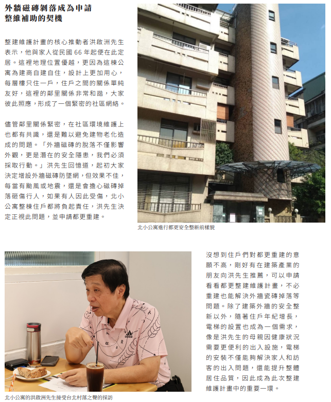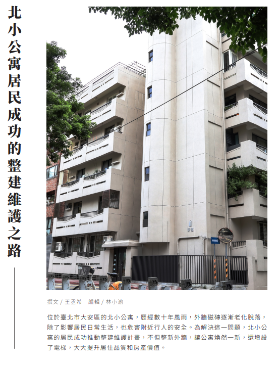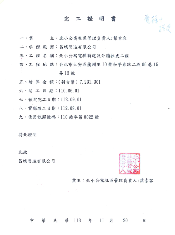 北小工寓電梯新建工程 承攬工程案: 工程名稱:110年北小工寓電梯新建工程 承包廠商:昌鴻營造有限公司 監造單位:劉錦鐘建築師事務所 主辦單位:北小公寓電梯新建工程 開工日期:民國109年12月23日 完工日期:民國110年12月08日 工程概要:北小工寓電梯新建、北小工寓外牆更新 台北市的「北小公寓」屋齡47年,由於外牆磁磚掉落,加上5層樓沒有電梯,去年底開始外牆拉皮、增設電梯一次搞定,讓公寓變華廈,房價從每坪80幾萬漲到近百萬。
